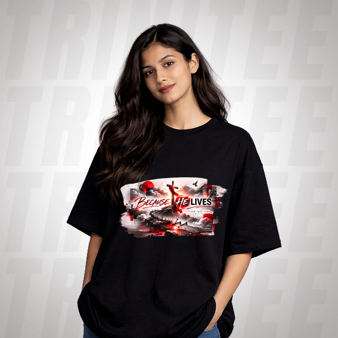 Featuring a striking graphic of the cross, crown of thorns, and resurrection elements, this design reflects the heart of the Gospel. The message “Because He Lives, I can face tomorrow” stands as a reminder that His sacrifice brought redemption, hope, and new life.