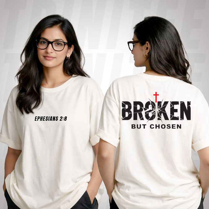 The Broken But Chosen Tee by Trinitee is a powerful reminder of grace and redemption. Inspired by Ephesians 2:8, this design speaks to the truth that we are saved by grace, not by our perfection. Even in brokenness, we are chosen and loved.