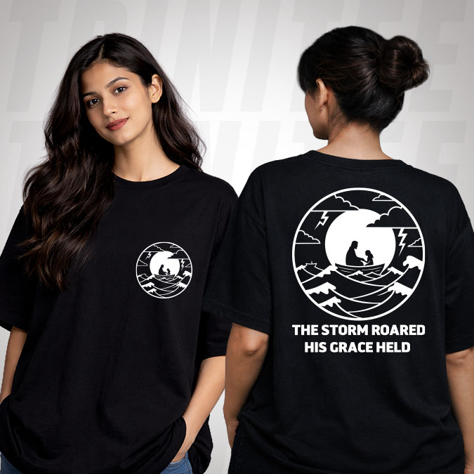 Featuring the message “The storm roared, His grace held” with a striking graphic of a boat in the storm and Jesus beside a girl, this design reflects faith, protection, and unwavering grace. It represents the truth that when the waves rise, His presence carries us through.
